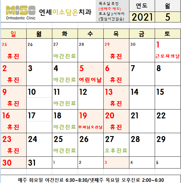 2021년 5월 진료 및 5/1(토) 근로자의 날 휴진안내
