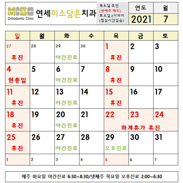 2021년 7월 진료시간, 7월22일(목)-24일(토) 하계휴가 휴진 안내
