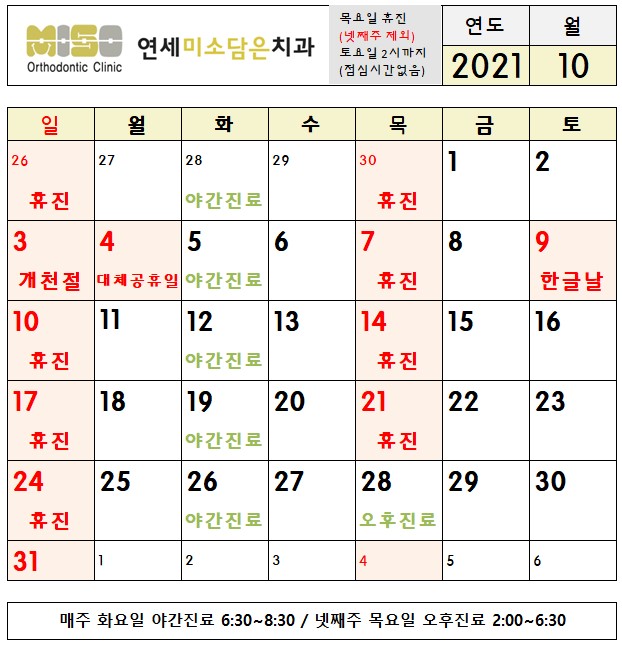 2021년 10월 진료시간, 10/4(월) 대체공휴일 휴진안내