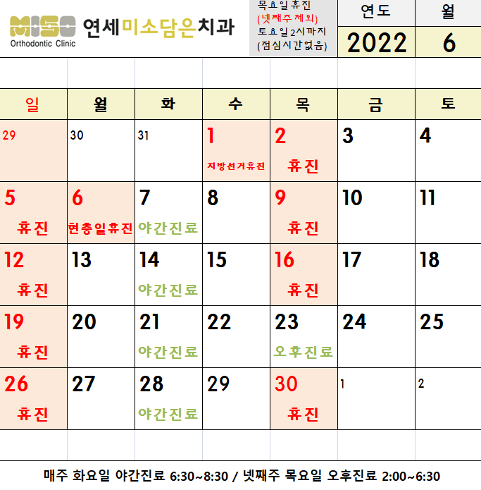 2022년 6월 진료시간, 6/1(수) 지방선거일, 6/6(월) 현충일 휴진 안내