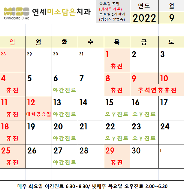 2022년 9월 진료시간, 9/8 (목) ~ 9/12 (월) 추석연휴 및 대체공휴일 휴진 안내