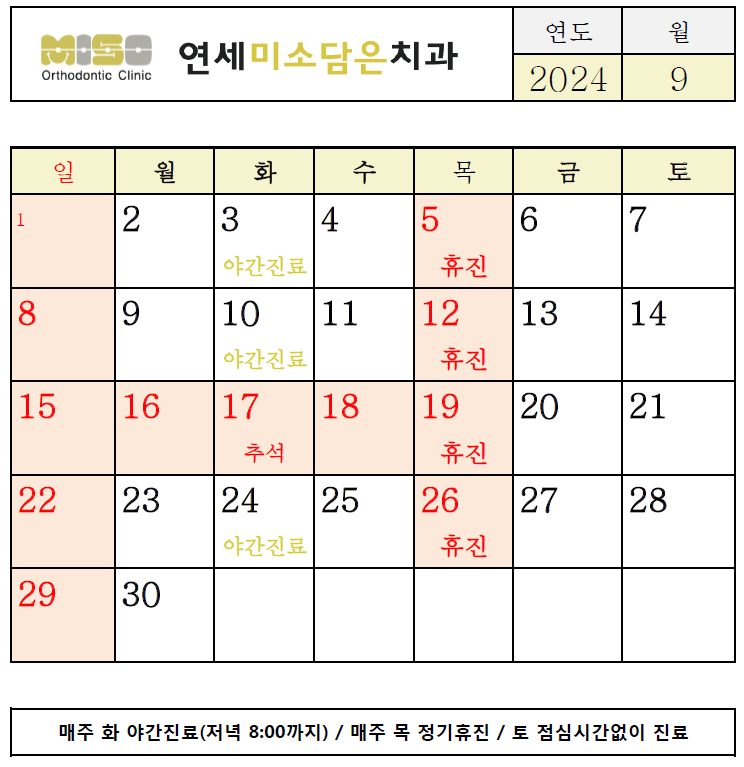 2024년 9월 진료시간 및 추석연휴휴진(9.16-9.19) 안내